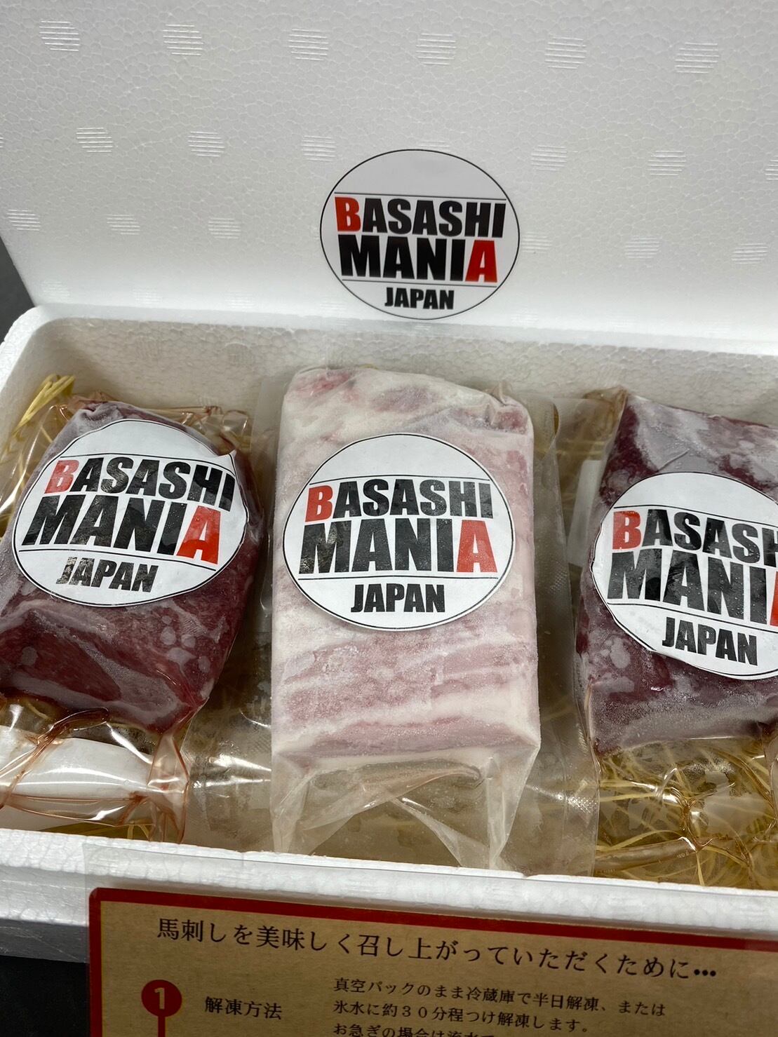馬刺しは冷凍ブロックになっていますので、解凍後スライスして付属のタレでお召し上がりください。